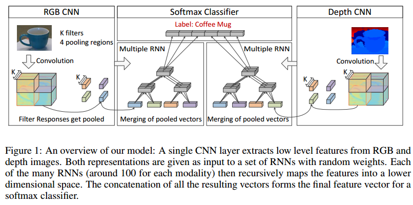 3D Sensing 기술의 발전으로 이미지의 색상 RGB와 Depth 정보를 추출할 수 있어, 이 둘을 활용하여 object recognition 성능을 향상시킬 수 있습니다. 해당 논문은 RGB-D 이미지를 분류하기 위해, CNN과 RNN을 활용합니다. CNN은 edge와 같은 low-level 이동 불변 특성을 추출하고, 고차원 특징을 구성하기 위해 이 저차원 특징을 RNN에 전달합니다.