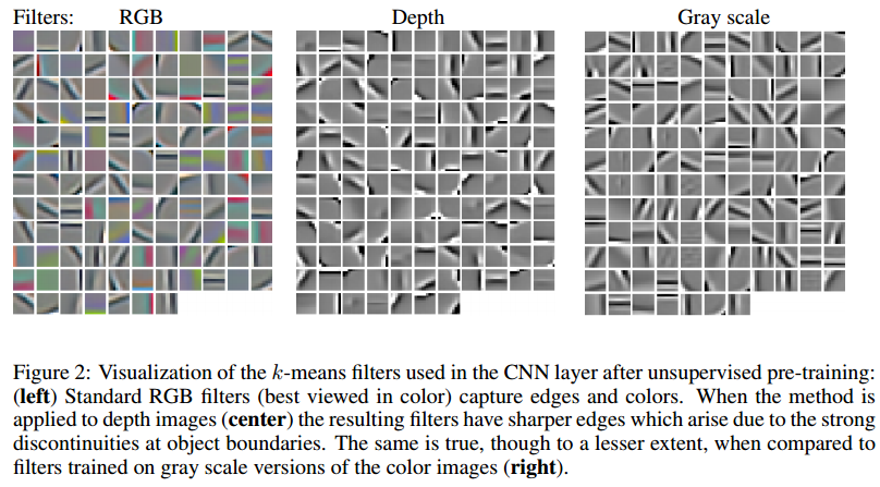 우선, RGB, Depth 두 set으로부터 무작위 patch를 추출합니다. 각 patch는 normalize와 whiening을 거쳐서 전처리 됩니다. 전처리된 patch는 k-mean를 수행하여 cluster 됩니다. 아래 그림은 clustering된 filter 결과입니다.