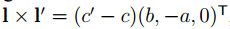 두 선 ax + by + c = 0과 ax + by + c' = 0을 고려하겠습니다. 이 둘은 l = (a, b, c)^T 와 l' = (a, b, c')^T로 나타낼 수 있습니다. 이 둘의 교점을 구하는 것은 어렵지 않습니다. 이전 포스팅에서 배웠던 것 처럼 두 선을 외적하면 됩니다.