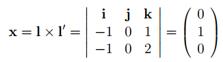 예제 문제를 풀어보겠습니다. 두 직선 x=1, x=2가 존재하는 경우에 두 직선은 평행하며 무한에서 교차합니다. homogeneous 표현으로 다음과 같이 나타낼 수 있습니다.