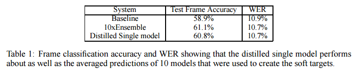 또한 student model이 10개의 모델을 ensemble한 model과 비슷한 정확도를 보여줍니다. 10개의 모델을 ensemble하는 비용을 생각하면, knowledge distillation은 정말 효과적인 방법입니다.