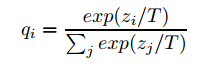 위 식에서 T는 temparature을 의미합니다. T가 높으면 soft label을 출력하고, T=1이면 hard label을 출력합니다.