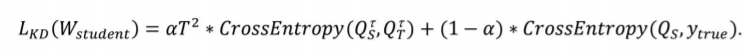 첫 번째 항은 teacher model에서 Soft Label을 계산하고, 이 Soft label과 동일한 결과값을 출력하도록 student model을 학습합니다. T는 soft label을 계산할 때 사용하는 temparature 입니다.