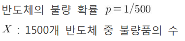 반도체 생산 공정에서 평균 500개 중 한 개 정도가 불량품이 발생한다고 합시다. 불량품은 무작위로 발생합니다.
