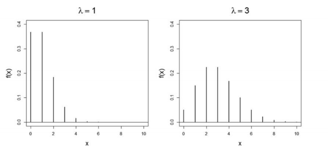 포아송분포는 평균 $\lambda$의 값에 따라 분포의 형태가 결정됩니다.