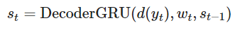 이 weighted vector를 decode embedding과 concat하여 rnn에 입력값으로 입력합니다. 이는 decode embedding과 가장 연관있는 encode output을 함께 입력하는 것으로 생각해볼 수 있습니다. weighted vector의 차원은 [1, batch size, encode_hidden_dim * 2]를 갖고, decode embedding의 차원은 [1, batch, emb_dim] 입니다.
