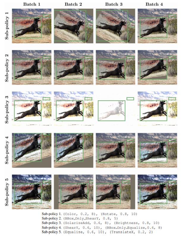 good policy에서 가장 흔하게 사용한 operation은 Rotate와 Equalize, BBox_only_TranslateY 입니다. rotate는 이미지 회전, Equalize는 pixel value의 histogram을 flatten, BBox_only_TranslateY는 bbox내의 이미지를 translation한것을 의미합니다.