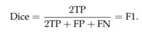 Dice를 boolean data(binary segmentation map)에 적용할 때, Dice coefficient는 F1 score와 동일합니다.