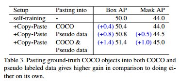 self-training을 하는 경우에 COCO image와 pseudo image 모두 copy-paste를 적용하는 것이 성능이 좋습니다.