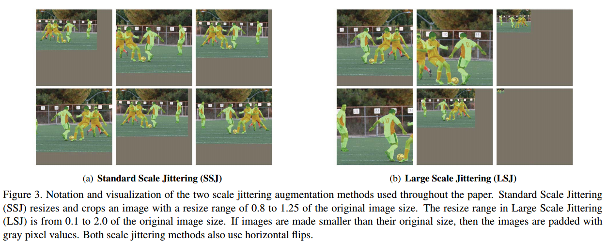 copy-paste와 함께 사용하는 augmentation 입니다. Standard Scale Jittering(SSJ)는 이미지를 0.8~1.25 범위로 resize crop을 합니다. Large Scale Jittering(LSJ)은 이미지를 0.1~2.0 범위로 resize crop 합니다. 원본 이미지보다 작아지면 gray pixel value로 pad 합니다.