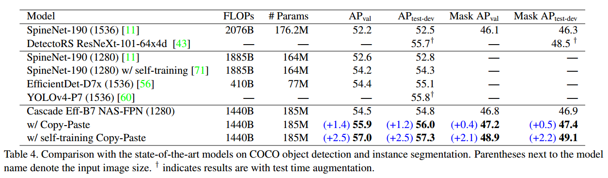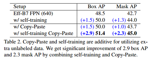논문에서 제안하는 Copy-Paste는 large scale jittering과 Noisy Student의 self training을 함께 사용하여 큰 성능 향상을 보여줍니다.