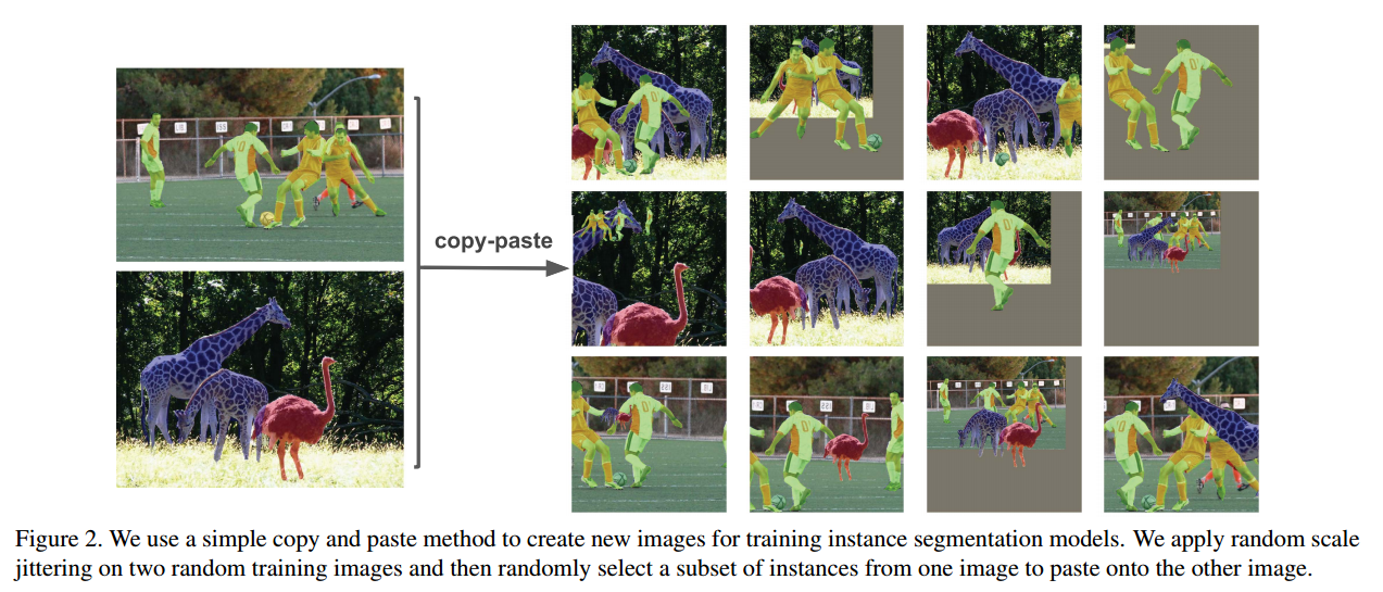 무작위로 두 개의 이미지를 선택하고 random scale jittering과 rando horizontal flipping을 적용합니다. 그리고나서 선택된 두 개의 이미지 중 하나의 이미지에서 객체를 무작위로 선택하고 다른 이미지에 붙여넣습니다. 마지막으로 grounth-truth를 수정합니다. scale jittering에의해 완전히 가려진 mask는 제거하고 부분적으로 가려진 객체는 mask를 갱신합니다.