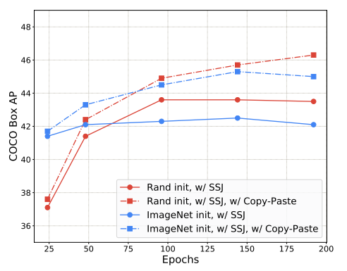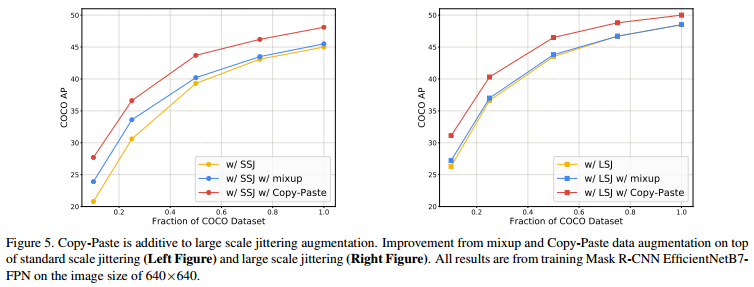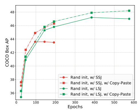 LSJ를 copy-paste와 함께 사용할 때 더 큰 성능 향상을 보입니다. 하지만 더 오랜 기간 학습이 필요합니다.
