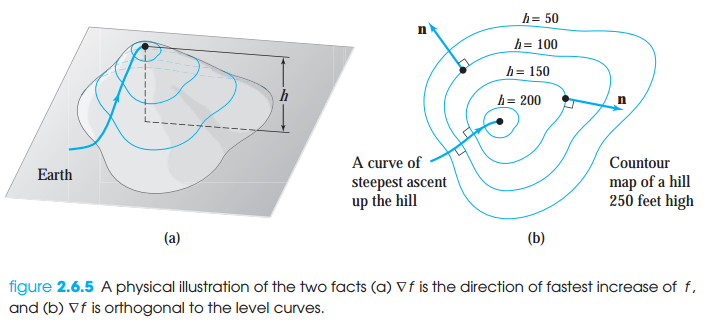 그리고 이것을 언덕의 level contours라고 합니다. 이 언덕에서 가장 빠르게 정상으로 가는 방법은 level contours에 직교하는 방향으로 걷는 것입니다. level curves에 직교하는 방향은 함수 f가 가장 빠르게 증가하는 방향이며, 그래디언트가 나타내는 방향입니다.