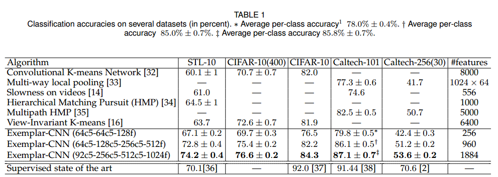 논문에서는 self-supervised learning인 Exemplar 방법을 제안합니다. 간단하게 설명하자면 unlabeled image 로부터 patch를 추출하고, 이 patch에 다양한 transformation을 적용한 뒤에 해당 집합은 동일한 클래스 i를 부여합니다. 동일한 patch에 대해 여러 transformation을 적용한 patch를 동일한 class로 예측하도록 모델을 훈련한다면, 모델은 generic features를 학습할 수 있습니다. 이 말은 즉 transformation에 invariant한 속성을 갖게 되며, 동일한 class 내에 존재하는 patch가 갖고 있는 공통된 특징을 최대화하고, 서로 다른 class내에 존재하는 patch들의 different feature을 구별하는 능력을 키웁니다. 이 방법으로 unsupervised learning methods 중에서 SOTA를 달성합니다.