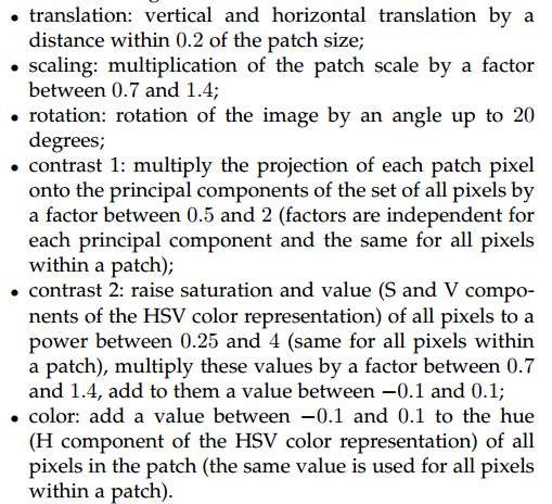 위 그림처럼 unlabeled dataset으로부터 patches를 추출합니다. 이 patches를 seed patches 또는 exemplars라고 부릅니다. 각 patch에 대하여 a개의 transformation으로 구성된 K개의 transformation set을 적용합니다. 논문에서는 아래의 transformation을 사용합니다.