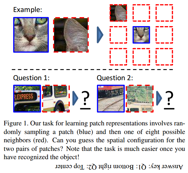 위 그림에서 8개의 공간 배열에서 무작위로 한 쌍의 patches를 추출합니다. 한 쌍의 patches를 추출하는 방법은, 하나의 patch를 추출하고 이 patch에 8번째 위치중 무작위로 patch를 추출합니다. 그리고 이 쌍을 CNN에 입력합니다. 입력은 두 patch와 첫 번째 patch에 대한 두 번째 patch의 상대적인 위치를 label로 입력합니다. 그리고 이미지 내에서 patch간의 위치에 대한 정보를 제공하지 않고 신경망이 patch의 상대적인 위치를 예측하도록 합니다.