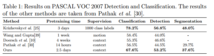 transfer learning의 결과입니다. ImageNet으로 supervision 학습한 모델보다 성능이 뒤떨어지지만, 간극을 좁힐 수 있었으며 다른 unsupervised learning 방법 중에서 sota를 달성합니다.