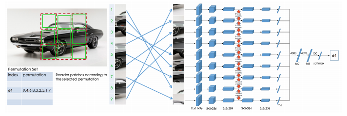 9개의 타일을 고려하면 총 9!=362,880개의 순열이 생성됩니다. 모든 순열을 다 학습할 수 없으므로 하나의 이미지당 69개의 순열을 사용합니다.