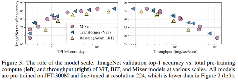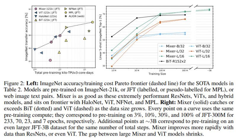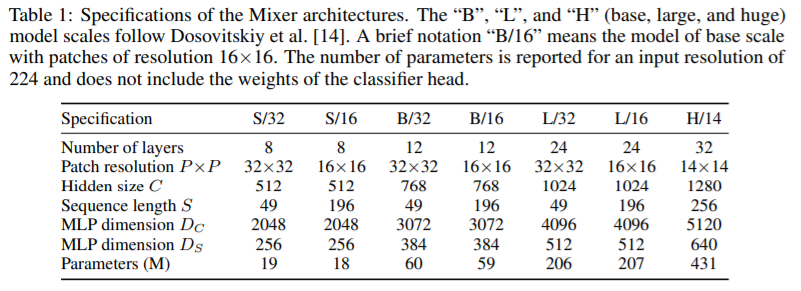 column 차원은 patch size에 독립적이므로 MLP-mixer의 연산량은 이미지의 pixel 수에 선형적으로 증가합니다. 이는 일반적인 CNN과 동일합니다.