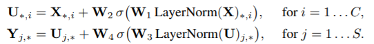 MLP-Mixer는 동일한 size의 다수의 레이어로 구성되어 있으며, 각 레이어는 두 MLP block으로 이루어져 있습니다. 첫 번째는 token-mixing MLP입니다. 입력값 X의 각 column에 적용하는데, 이는 X를 전치하여 구현합니다. 각 column에 각각의 MLP를 적용합니다. 또한 MLP는 GELU, Residual connection, LayerNorm을 함께 이용합니다. 두 번째는 channel-mixing MLP block입니다. 이는 X의 row에 대하여 MLP 연산을 수행합니다.
