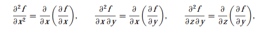 삼계도함수나 고계도함수도 같은 방법으로 나타낼 수 있습니다. f가 두 변수 x와 y의 함수이고, 편미분이 연속적으로 미분가능하면 이 함수의 편도함수는 다음과 같은 네 개의 함수를 얻습니다.