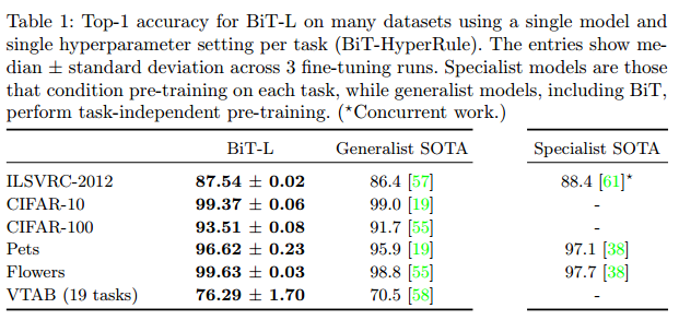 BiT는 large supervised dataset에 대하여 pre-training을 한 뒤에 target task에 모델을 fine-tunning합니다. 300M 이미지를 갖고 있는 JFT dataset으로 pre-training 하고, 20개 dataset에 대해 fine-tunning하여 강력한 성능을 나타냅니다.