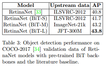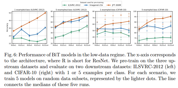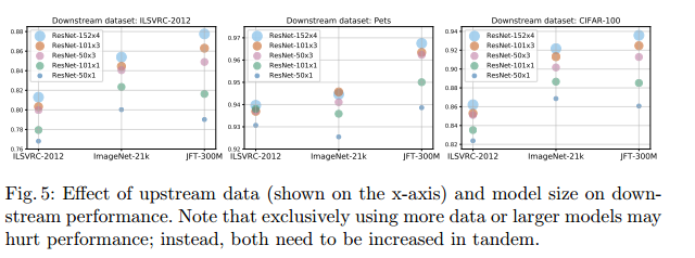pre-training에서 dataset size, 모델 size가 미치는 역할을 조사하기 위해 3개의 dataset에 대해 3개의 BiT model을 학습합니다. 3개의 dataset은 ILSVRC-2012(BiT-S, 1.3M images), ImageNet-21k(BiT-M, 14M images), JFT(BiT-L, 300M images)