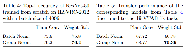 BiT는 순수한 ResNet-152x4에 Group Normalization(GN), Weight Standardization(WS) 를 사용합니다. BN대신에 GN을 사용하는 이유는 모델 크기가 너무 커서 작은 batch size를 사용해야합니다. 작은 배치 사이즈를 사용하는 경우에 BN은 안좋은 성능을 타나냅니다. 또한 BN 내부에 학습 가능한 파라미터가 존재하여 transfer시에 이를 갱신해야 합니다. 논문에서는 GN과 WS의 결합이 small-batch training에 적합하다고 합니다.