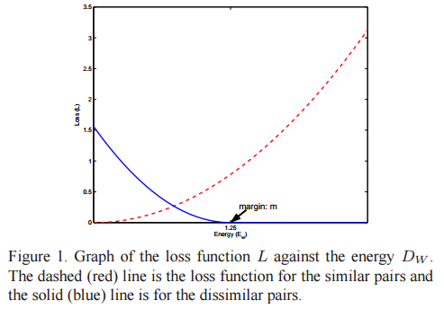 m은 margin이며 G(X)의 반지름을 결정합니다. 이 반지름 내에있는 dispair만 loss에 기여합니다. 이렇게 Ld를 설정하면, Dw는 m과 동일할 시에 loss가 0이 됩니다. 즉, dispair가 입력된 경우에 Dw가 m과 동일하도록 합니다. 이 말은 두 쌍의 dispair이 거리 m을 갖도록 밀어내는 것을 의미합니다. 반면에 pair가 입력되면 Y=0이 되어 첫 번째 항만 존재하게 되는데 이는 두 pair가 항상 가까워지도록 합니다. margin을 설정한 이유는, margin 없이 loss를 최소화하는 경우에 신경망의 파라미터가 L=0이 되도록 상수가 될 수 있다고 합니다.