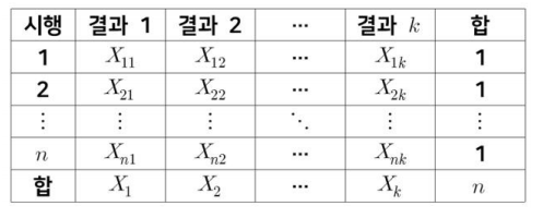이해를 돕기 위해 $(X_1, X_2, ... , X_k)$ : n번 시행했을 때, 각 결과의 횟수를 적어둔 표를 보겠습니다.