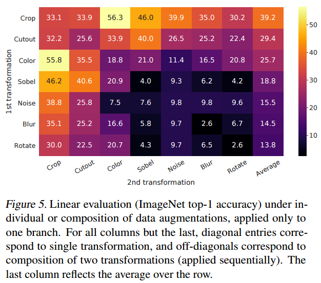 contrastive learning은 batch내에 이미지를 추출하여 2개의 transformation을 적용해 각각 query와 key를 생성합니다. 동일한 image에 적용된 transformation은 similar이고, 나머지 batch에 존재하는 다르 이미지에 transformaton을 적용한 이미지는 dissimilar가 됩니다. 이처럼 augmentation을 적용하는데, 어떤 augmentation이 효과적인지 실험을 합니다.