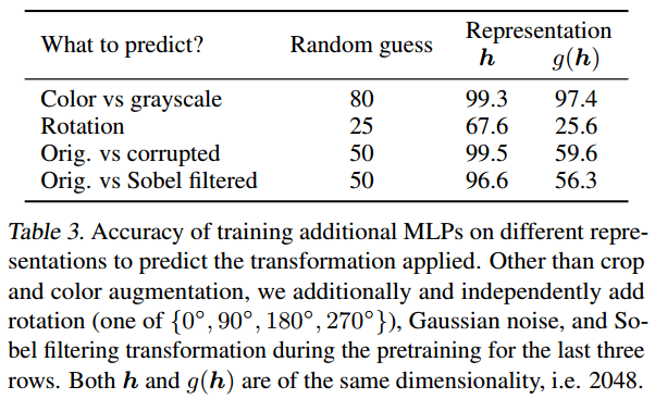 위 표는 g(h)는 정보가 손실되고, h는 적용된 transformation에 대해 더 많은 정보를 포함하고 있다는 것을 보여줍니다.