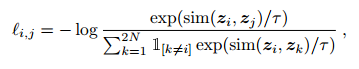 논문은 아래와 같은 loss function을 사용하고 이를 NT-Xent loss(normalized temperature-scaled cross entropy loss)라고 부릅니다. 그리고 NT-Xent loss를 다른 loss들과 비교하는 실험을 합니다. 또한 normalized embedding와 적절한 temperature를 적용한 contrastive cross entropy loss의 효과를 실험으로 보여줍니다.