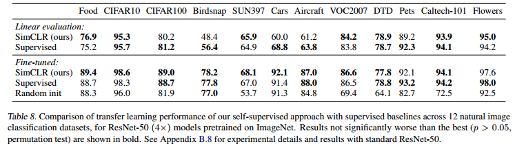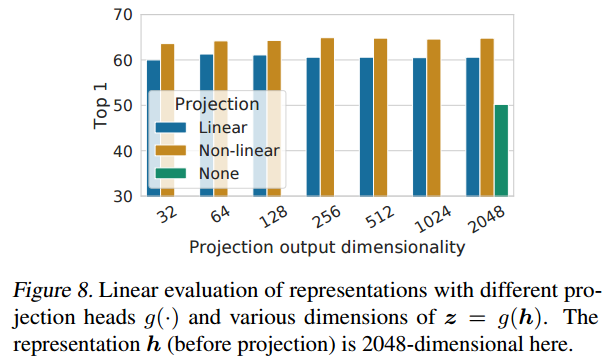 encoder가 representation을 생성하고, 이 representation에 non linear head를 사용하면 성능이 더 좋아집니다. 논문은 MLP + ReLU + MLP 구조의 non linear head를 사용합니다. 저자는 nonlinear projection이 중요한 이유는 contrastive loss에 의해 유발되는 정보 손실 때문이라고 설명합니다.