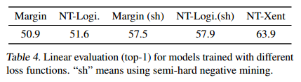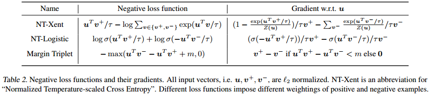 위 표에서 gradient를 살펴보면 NT-Xent는 positive 와 negative example 각각에 서로 다른 weight를 가하고 있습니다. 이 덕분에 hard negative mining 효과가 있습니다.