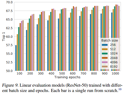 contrastive learning에서 중요한 것은 negative sample의 수 입니다. large batch와 longer training을 한다면 많은 negative sample을 사용할 수 있습니다.
