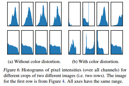 동일한 이미지 내에서 random crop을 한 경우에 crop된 이미지는 동일한 color distribution을 갖습니다. 따라서 모델은 color histogram 정보를 사용하여 구별을 할 수 있는데, 이를 방지하기 위해 color distortion을 적용합니다.