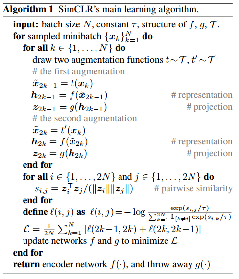하나의 이미지에 2개의 transformation을 적용합니다. 만약 8192 batch size를 사용한다면 한 배치내에 16382의 negative sample이 존재합니다. 2개은 positive pair 입니다. batch size가 너무 커도 학습이 unstable 하므로 LARS optimizer와 Global BN을 사용합니다.