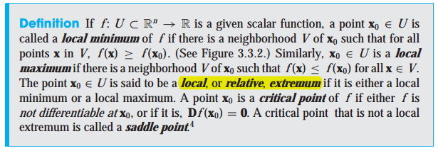 만약 f가 x0에서 미분이 가능하지 않고, Df(x0) = 0 이라면 점 x0을 임계점(critical point)라고 합니다. 극점(local extremum)이 아닌 임계점(critical point)를 안장점(saddle point)라고 합니다.