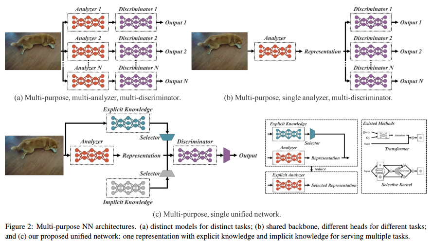 (1) explicit knowledge와 implicit knowledge를 통합하여 general representation을 학습하는 unified network를 제안합니다. 또한 이 general representation을 통하여 다양한 task를 수행할 수 있습니다.