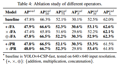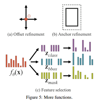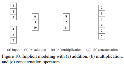 여러 task에 적용될 수 있는 함수들을 고려하면, implicit knowledge는 더 많은 functions들로 확장될 수 있습니다. (a)는 바운딩박스 중심 좌표를 예측하기 위한 덧셈 연산, (b)는 앵커 박스의 하이퍼파라미터를 자동으로 탐색하기 위한 multiplication, (c)는 multi-task feature selection을 수행하기 위해 dot multiplication과 concat이 사용됩니다.