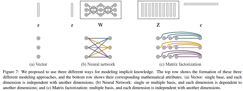 (3) implicit knowledge를 modeling 하기 위한 도구로서 the ways of using vector, neural network, or matrix factorization