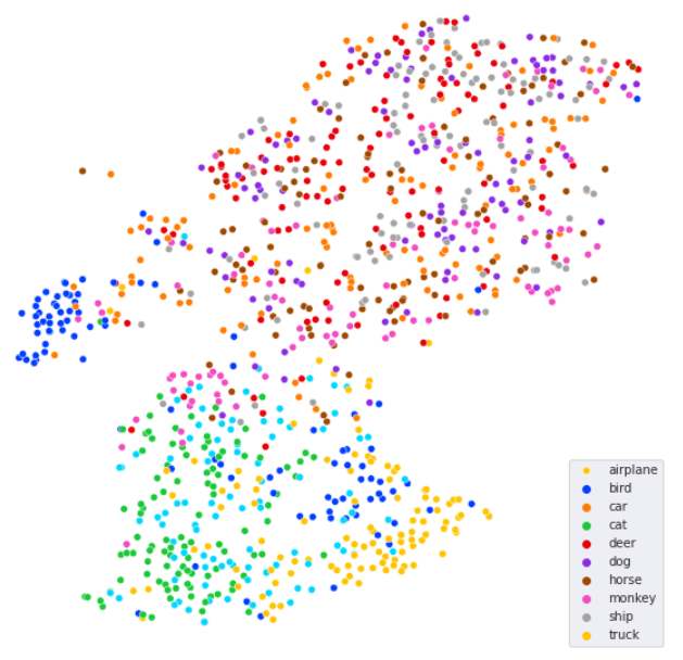 plt.legend(['airplane', 'bird', 'car', 'cat', 'deer', 'dog', 'horse', 'monkey', 'ship', 'truck'])