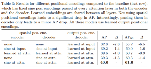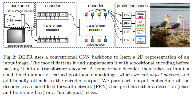 dxHW로 flatten하여 encoder의 input으로 입력합니다. d는 각 sequence의 입력이 되어 결국 d개의 1xHW token이 encoder로 입력됩니다. 기존의 transformer와 동일하게 positional embedding을 적용합니다. decoder를 거쳐서 N개의 output embedding이 생성되고 각각은 독립적으로 FFN에 전달되어 N개의 final prediction을 생성합니다.