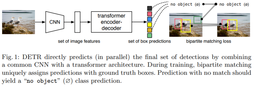 해당 논문은 direct set prediction을 위한 transformer eocoder-decoder 구조와 set prediction을 위한 bipartite matching loss를 제안합니다. set prediction은 object detection 모델이 각 object에 대하여 set of bounding boxes와 category labels을 예측하는 task를 의미합니다. 기존 방법들은 이 set prediction은 proposals를 사용하여 간접적으로 문제를 해결해 왔습니다.