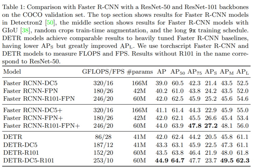backbone은 renset, optimization은 AdamW를 사용합니다. 아래 표에서 DC5는 5stage에서 dilated를 했다는 것을 의미합니다.