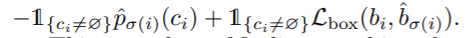 matching cost는 class prediction과 rpedicted, gt와의 유사도를 설명합니다. yi는 ci,bi로 구성되어 있으며 c는 class, b는 바운딩박스 좌표를 나타냅니다.