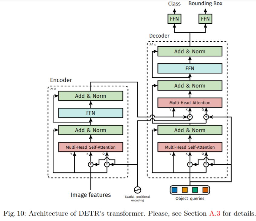 dxHW로 flatten하여 encoder의 input으로 입력합니다. d는 각 sequence의 입력이 되어 결국 d개의 1xHW token이 encoder로 입력됩니다. 기존의 transformer와 동일하게 positional embedding을 적용합니다. decoder를 거쳐서 N개의 output embedding이 생성되고 각각은 독립적으로 FFN에 전달되어 N개의 final prediction을 생성합니다.