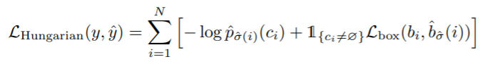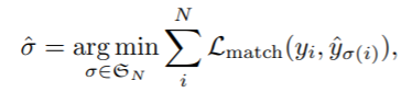 ground truth $\hat{y}$는 N보다 적은 수를 갖습니다. 따라서 N개가 되도록 $\phi$(no object) 로 padding 을 합니다. 이제 N개의 ground truth와 prediction을 bipartite matching을 하기 위해 가장 낮은 cost를 갖도록 N개의 순열을 탐색합니다.